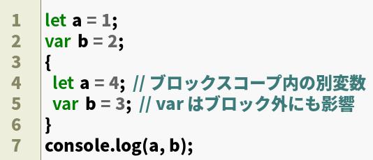`let` はブロックスコープのため外側の `a` は 1 のままですが、`var` はブロックスコープを持たないためブロック内の再代入が外側にも反映されます。したがって `console.log(a, b)` は `1 3` を出力します。