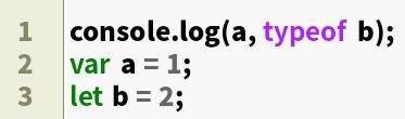 `var a` は巻き上げ(宣言のホイスティング)により `undefined` として参照可能ですが、`let b` は宣言前の「一時的デッドゾーン(TDZ)」にあるため、`typeof b` であっても参照時に `ReferenceError` となり実行時エラーになります。