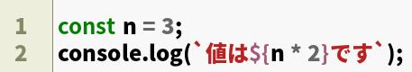 テンプレートリテラル内の `${…}` では式が評価されます。`n * 2` は `6` なので、`”値は6です”` が出力されます。