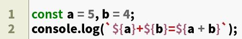 テンプレートリテラルは `${}` 内で式を評価した結果を埋め込みます。`a + b` は `9` のため、`”5+4=9″` が出力されます。