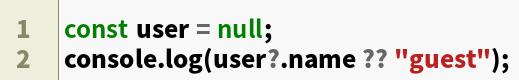 `user` が `null` のためオプショナルチェーン `user?.name` は `undefined` を返し、`??`(null 合体)により右辺 `”guest”` が選択されます。