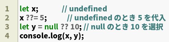 `??=` は左辺が `null` または `undefined` のときのみ代入します。`x` は `5`、`y` は `10` となり、`”5 10″` が出力されます。
