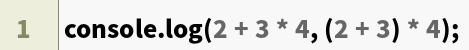 乗算は加算よりも優先されます。左は `2 + (3 * 4) = 14`、右は `(2 + 3) * 4 = 20` です。