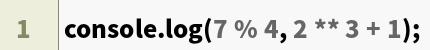 剰余 `7 % 4` は `3`、累乗 `2 ** 3` は `8` で、`+ 1` により `9` となります。