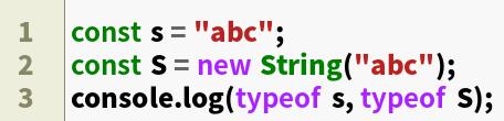 JavaScript の文字列リテラルはプリミティブ型であり `typeof “abc”` は `”string”` です。一方 `new String(“abc”)` はオブジェクト生成であり `typeof` は `”object”` を返します。