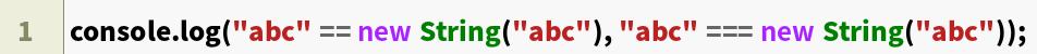 `==` は必要に応じて型変換を行うため、`new String(“abc”)` はプリミティブに変換され `”abc”` と等価です。一方 `===` は型まで厳密に比較するため、プリミティブとオブジェクトは等しくありません。