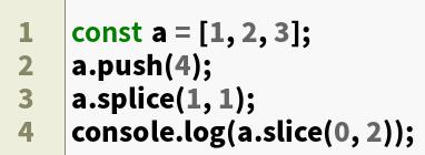 `push` で `[1,2,3,4]`、`splice(1,1)` でインデックス1の要素(2)を削除して `[1,3,4]`、`slice(0,2)` は先頭2要素を取り出すため `[1,3]` が出力されます。