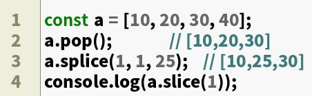 `pop` で末尾の 40 を削除、`splice(1,1,25)` でインデックス1の要素を 25 に置換した結果 `[10,25,30]`。`slice(1)` は `[25,30]` を返します。
