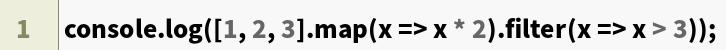 `map` で `[2,4,6]` に変換し、`filter(x>3)` で `4` と `6` が残るため、`[4,6]` が出力されます。