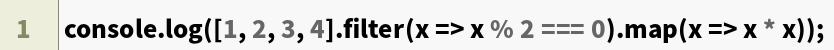 `filter` で偶数 `[2,4]` を取り出し、`map(x=>x*x)` で各要素を2乗して `[4,16]` が出力されます。