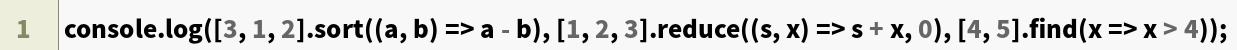 `sort` で昇順に `[1,2,3]`、`reduce` で和は `6`、`find(x>4)` は最初に一致する `5` を返します。