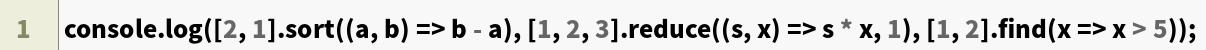 `sort((a,b)=>b-a)` で降順 `[2,1]`、`reduce(*, 初期値1)` で積は `6`、`find(x>5)` は見つからず `undefined` を返します。