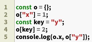 オブジェクトのプロパティはドット記法とブラケット記法のどちらでもアクセスできます。`o.x` は 1、`o[“y”]` は 2 を参照します。