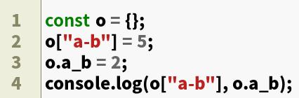 プロパティ名にハイフンなどの記号が含まれる場合はブラケット記法でアクセスします。一方 `a_b` は有効な識別子のためドット記法でアクセス可能です。