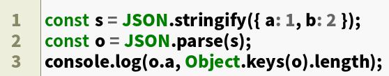 `JSON.stringify` でシリアライズし、`JSON.parse` でオブジェクトに戻しています。`o.a` は 1、キーは `a,b` の2つあるため `2` が出力されます。