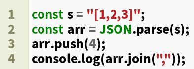 文字列からパースした配列に `4` を追加し、`join(“,”)` でカンマ区切りの文字列として出力するため、`”1,2,3,4″` となります。