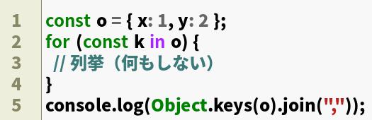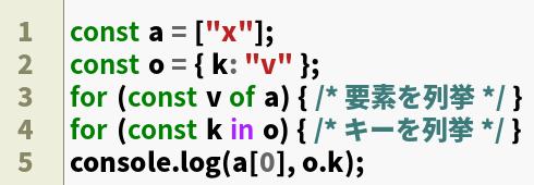 `for…of` は配列の値を列挙し、`for…in` はオブジェクトのキーを列挙します。`a[0]` は `”x”`、`o.k` は `”v”` です。