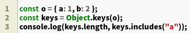 `Object.keys(o)` は列挙可能な自前プロパティキーを配列で返します。`{a,b}` の2つで長さは `2`、`”a”` を含むため `true` です。