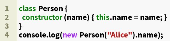 `constructor` で受け取った `name` をインスタンスに代入しています。`new Person(“Alice”).name` は `”Alice”` を参照します。