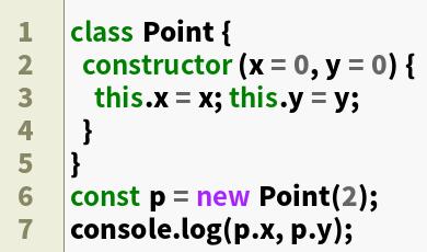 デフォルト引数により `y` は省略時に `0`。`new Point(2)` は `x=2, y=0` で、`”2 0″` が出力されます。