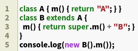 `super.m()` は親クラス `A` の `m` を呼び `”A”` を返します。`”B”` を連結して `”AB”` になります。