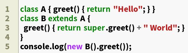 サブクラス `B` の `greet` は `super.greet()` の結果に `” World”` を連結するため、`”Hello World”` が出力されます。