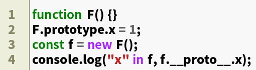 `”x” in f` はプロトタイプ連鎖上のプロパティも検出します。`__proto__` はインスタンスの内部プロトタイプ参照で、`F.prototype.x` は `1` です。