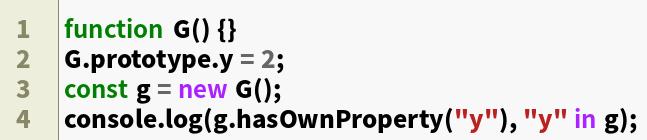 `hasOwnProperty` は自身の(直下の)プロパティのみ判定します。`y` はプロトタイプにあるため `false`、`in` 演算子は連鎖を辿るため `true` です。