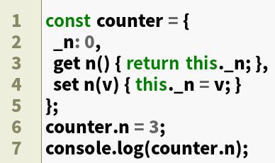 セッター `n` で `_n` に代入し、ゲッター `n` で `_n` を返しています。代入後の値 `3` が出力されます。
