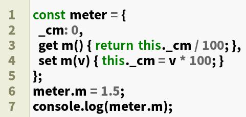 セッター `m` はメートルをセンチメートルに変換して `_cm` に保持し、ゲッター `m` は `_cm/100` を返します。`1.5` を設定しているため `1.5` が出力されます。