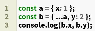 スプレッド構文で `a` のプロパティを展開しつつ `y:2` を追加しています。`b` は `{x:1,y:2}` となり、`”1 2″` を出力します。