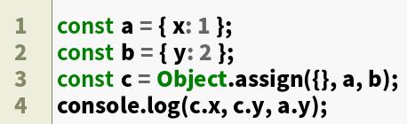 `Object.assign({}, a, b)` は新しいオブジェクトにプロパティをコピーします。`c` には `x` と `y` があり、元の `a` は `y` を持たないため `a.y` は `undefined` です。