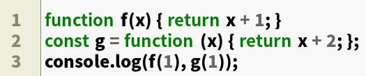 関数宣言 `f` と関数式 `g` はどちらも関数です。`f(1)` は `2`、`g(1)` は `3` を返すため、`”2 3″` が出力されます。