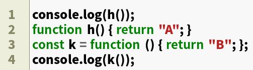 関数宣言は巻き上げ(ホイスティング)により定義前でも呼び出せます。一方、関数式 `k` は代入後に呼び出せます。よって上から `”A”`、`”B”` と出力されます。