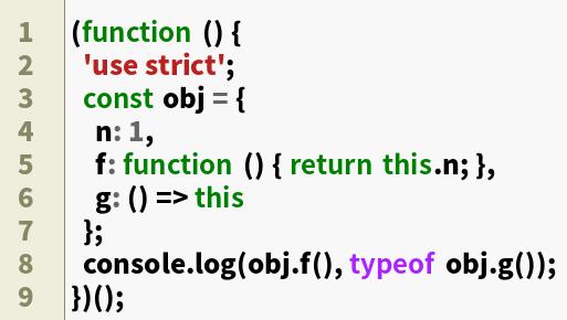 本問題は strict モードで評価します(IIFE 先頭の `’use strict’`)。通常の関数 `f` の `this` はレシーバ `obj` を指し `1` を返します。一方、アロー関数 `g` はレキシカルな `this`(ここでは `undefined`)を返すため、`typeof obj.g()` は `”undefined”` になります。