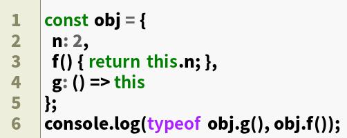 `obj.f()` は `this` が `obj` を指し `2` を返します。`obj.g()` はアロー関数のためレキシカルな `this` を返し、その型は `”object”` になります。