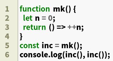 返された関数は外側の `n` をクロージャとして捕捉します。呼び出すたびに `n` がインクリメントされるため、最初は `1`、次は `2` が出力されます。