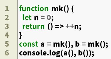 `a` と `b` は別々のクロージャを持つため、それぞれ独立にカウントされます。最初の呼び出しは両方とも `1` になります。