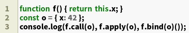 `call` と `apply` は呼び出し時に `this` を指定します。`bind` は新しい関数を返し、`this` が束縛された状態で実行できます。いずれも `o.x` を参照するため `42` になります。