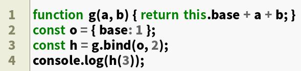 `bind(o, 2)` は `this` と第1引数に `2` を固定した関数を返します。残りの引数に `3` を渡すため、`1 + 2 + 3 = 6` が出力されます。