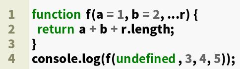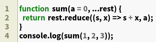 デフォルト引数 `a=0` と残余引数 `…rest` を用いています。`1 + 2 + 3 = 6` となります。