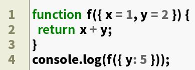 オブジェクトの分割代入で既定値を指定しています。`x` は省略時に `1`、`y` は渡された `5` で、合計 `6` になります。