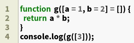 配列の分割代入で既定値を用いています。第1要素のみ `3` が与えられ、第2要素は既定値 `2` が使われるため、`3 * 2 = 6` が出力されます。