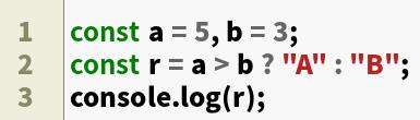 条件演算子 `cond ? x : y` は `cond` が真なら `x`、偽なら `y` を返します。`a > b` は真(`5 > 3`)なので `”A”` が出力されます。