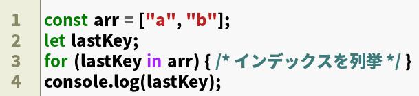 `for…in` は配列のインデックス(キー)を列挙します。キーは文字列として扱われるため、最後に代入されるキーは `”1″` で、そのまま `”1″` が出力されます。