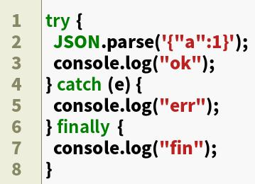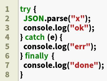 不正な JSON は `JSON.parse` で例外となり `catch` が実行され `”err”` を出力します。`finally` は常に実行されるため、その後に `”done”` が出力されます。
