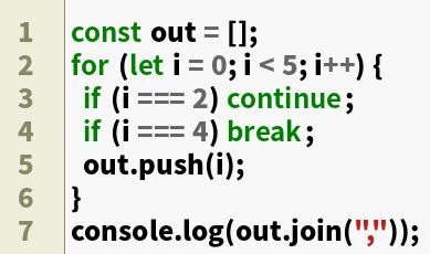`i===2` のとき `continue` でスキップされ、`i===4` で `break` によりループを終了します。`out` に追加されるのは `0,1,3` です。