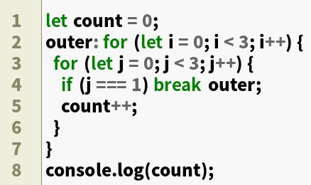 `i=0, j=0` のときに `count++` が1回実行され、次の `j=1` でラベル付き `break outer` により二重ループを抜けます。したがって `1` が出力されます。