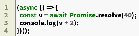 `await` で解決値 `40` を受け取り、`+ 2` して `42` を出力します。