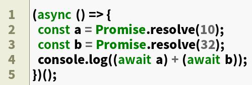 2つの Promise を個別に `await` し、和を出力しています。`10 + 32 = 42` です。